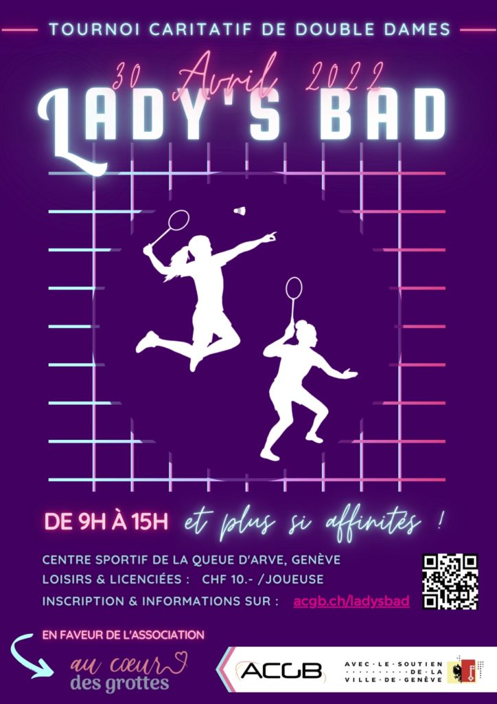 Le samedi 30 avril, venez pratiquer le double dames de façon conviviale dans un tournoi populaire dont les bénéfices seront entièrement reversés à l’association Au Cœur des Grottes ! Toutes les joueuses de badminton licenciées et loisirs  sont les bienvenues !