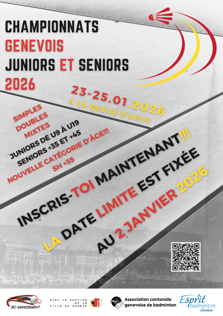 L’ACGB, en collaboration avec l’organisateur de l’édition 2026, BC Mandement, avec le soutien de la Ville de Genève et le partenariat de Esprit Badminton Genève, vous attend nombreux sur les courts en janvier !